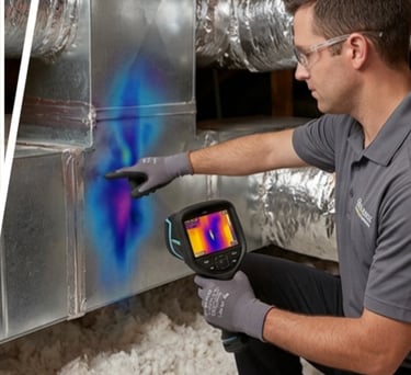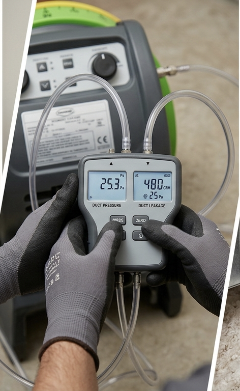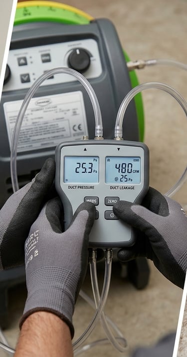 Duct Leakage Testing is performed to detect and measure air leaks in HVAC duct systems. It ensures that conditioned air reaches the intended spaces without loss, improving system efficiency, indoor comfort, and energy performance.